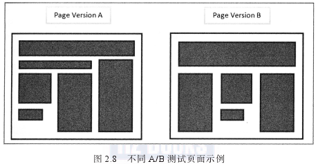大部分在线营销人员都从使用这种更简单的测试形式开始,然后再进化到更复杂的测试类型,如多变量测试(下面将做说明)。图2.8展示了一个例子,两个不同风格的页面在A/B测试中进行比较,它们的模块布局、横幅和图片都不同。