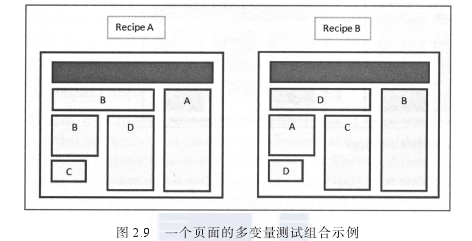 图2.9展示了可以在网站设计多变量测试中同时测试的两个页面元素组合(每个模块用不同的字母标注).测试可以找出表现最佳的元素组合。