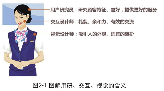 好的用户体验,就如同彬彬有礼的服务人员,不但能马上解决用户的问题,其优美的谈吐、机智的反应,也会给用户一次非常美妙的体验。如果把产品比做图2-1左侧的这个服务人员,那么这3个职位的作用正如图中所描述的那样。