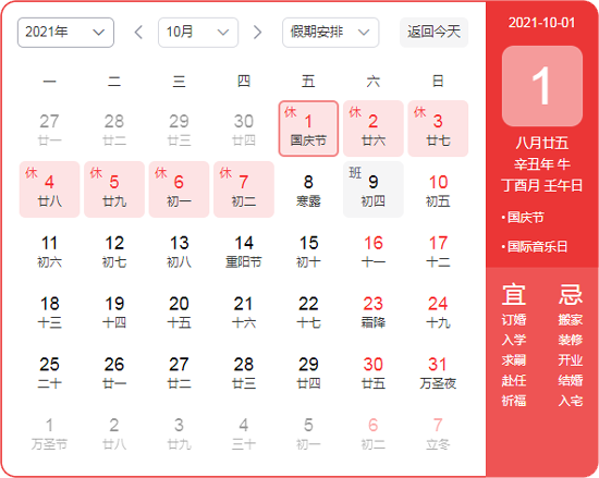 放假时间:2021年10月01日(周五)——2021年10月07日(周四),共七天。