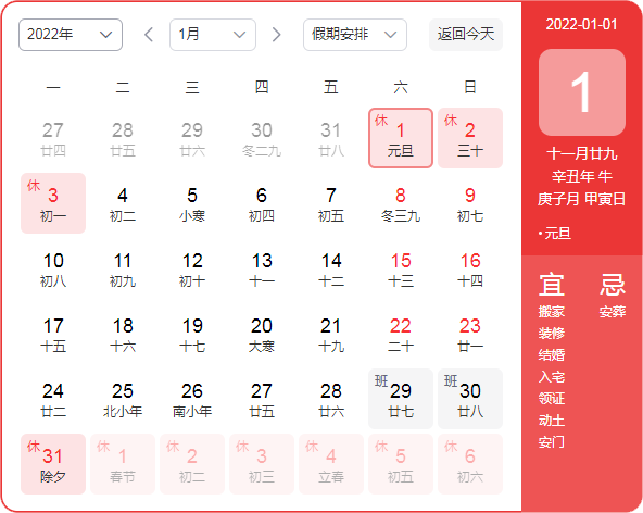 放假时间:2022年01月01日(周六)——2022年01月03日(周一),共3天。